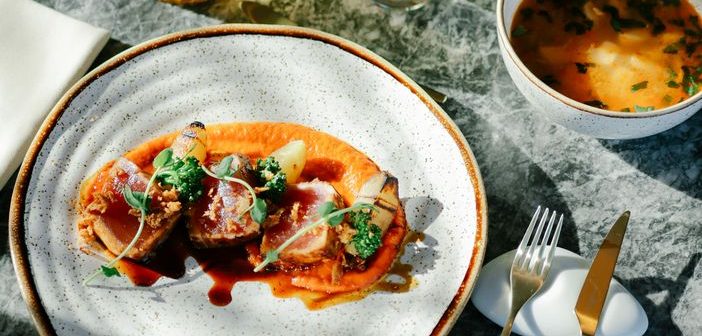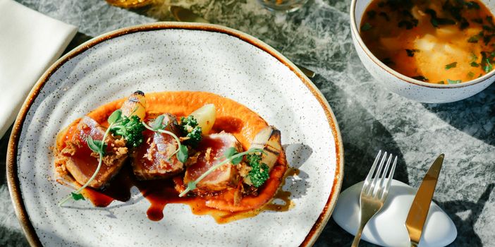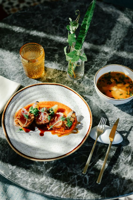 Como entrada, o Chef apresenta um reconfortante Caldo de peixe dos Açores, preparando o paladar para o prato principal: um suculento Naco de atum braseado, servido com puré de pimento vermelho, batata com açafroa na grelha, bimis e uma redução balsâmica que eleva o conjunto.