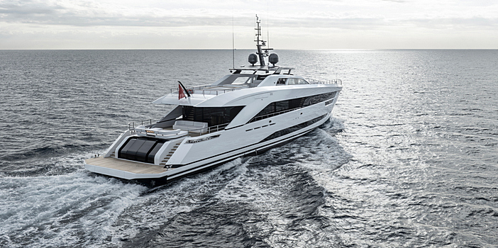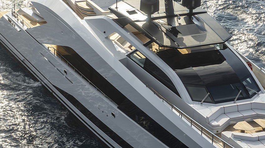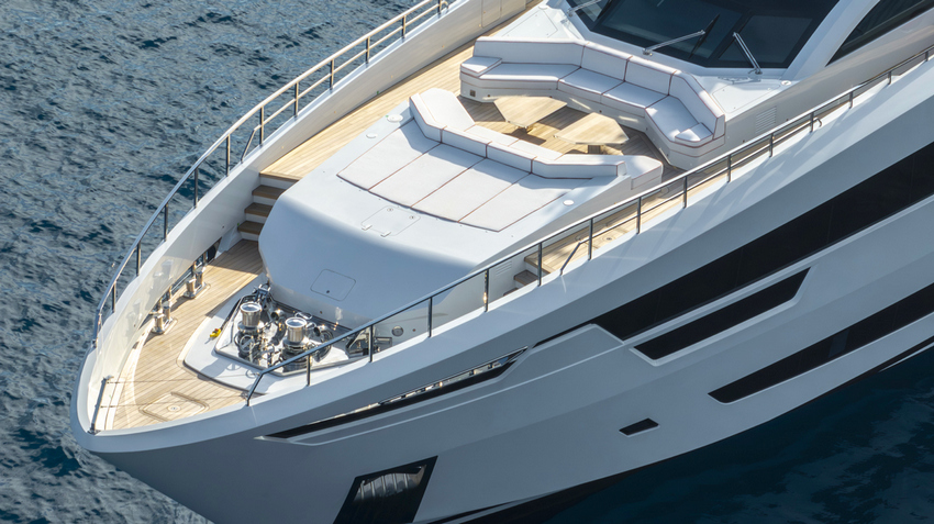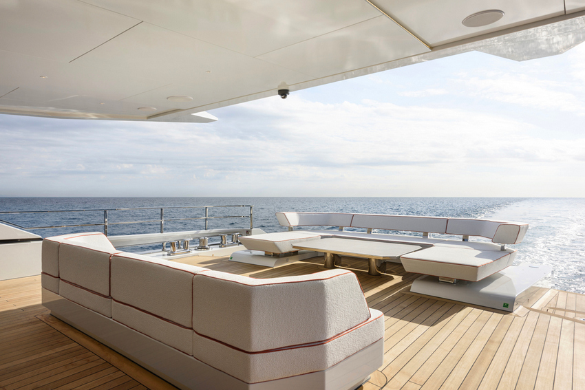 Ao nível da água, o beach club torna-se um ponto central da vida a bordo durante o dia. A ampla plataforma em teca convida ao contacto direto com o mar, enquanto uma plataforma hidráulica central facilita o acesso para banhos e a colocação na água de equipamentos náuticos.