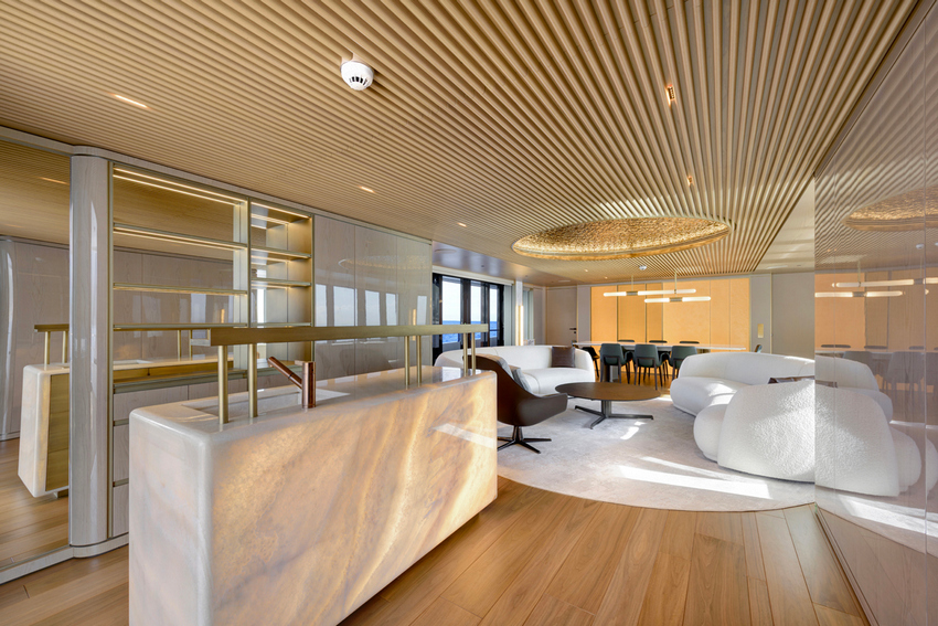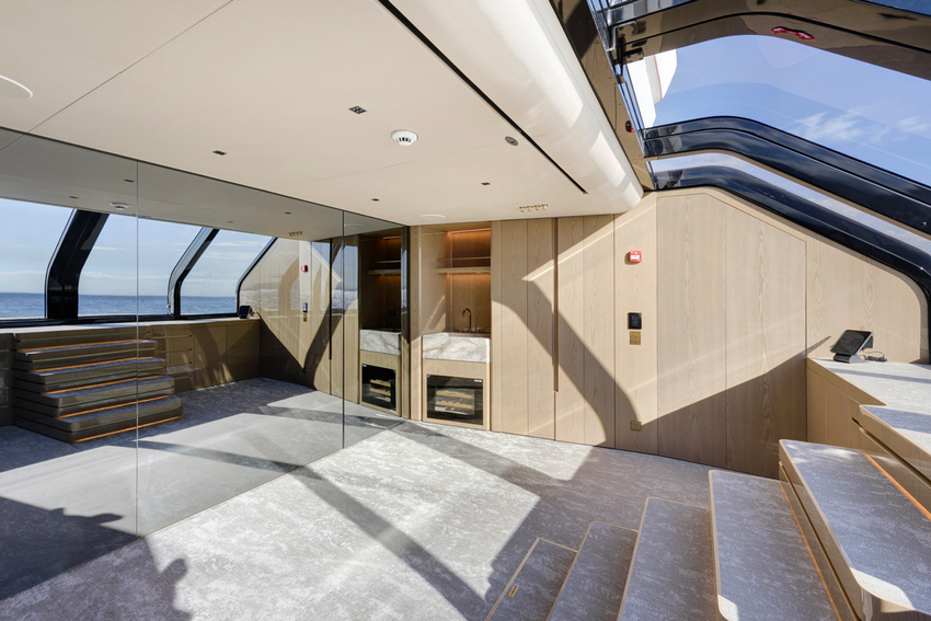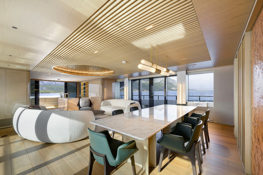 Existe um forte sentido de continuidade em todo o iate. O ónix marfim claro da Antolini surge tanto como elemento escultórico no bar como no centro da mesa de jantar. O pavimento em parquet de carvalho reflete a escala do revestimento exterior em teca. Vidro fumado ondulado, apontamentos em latão, lacados brilhantes e couro natural criam uma paleta rica mas equilibrada, enquanto curvas suaves substituem linhas rígidas.