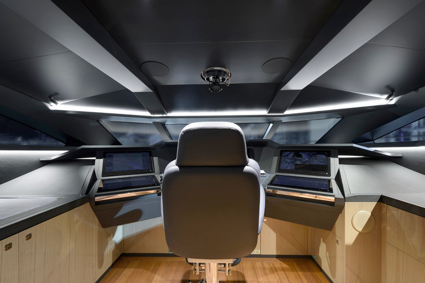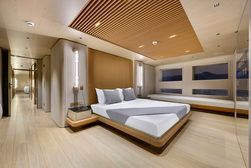 A suíte do proprietário, localizada à proa no convés principal, ocupa mais de 50 metros quadrados e foi concebida como um refúgio privado. Linhas visuais limpas, amplas superfícies envidraçadas e materiais equilibrados conferem-lhe uma atmosfera tranquila e residencial.