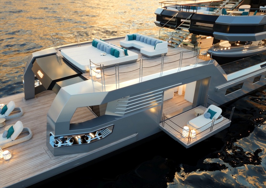 À popa, o beach club evolui para um lounge aberto em três frentes graças a terraços rebatíveis, bar de cocktails e acesso direto à água — menos plataforma de banho, mais deck de resort flutuante. A disposição geral privilegia a fluidez entre interior e exterior, mantendo uma ligação constante ao ambiente envolvente.