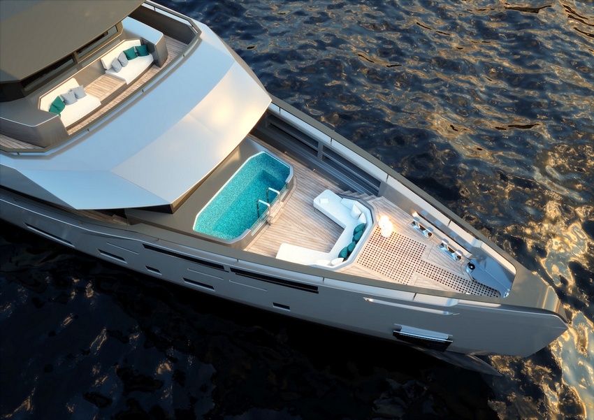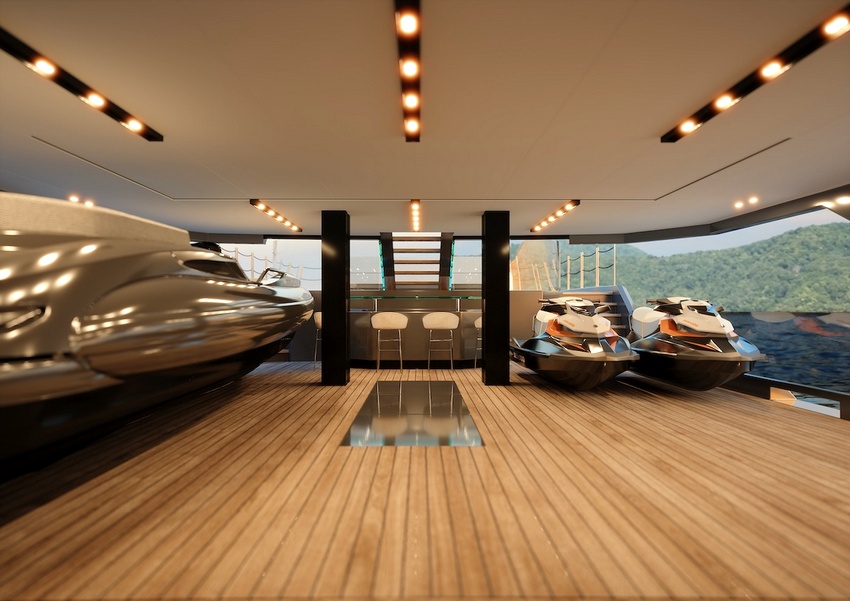 À popa, o beach club evolui para um lounge aberto em três frentes graças a terraços rebatíveis, bar de cocktails e acesso direto à água — menos plataforma de banho, mais deck de resort flutuante. A disposição geral privilegia a fluidez entre interior e exterior, mantendo uma ligação constante ao ambiente envolvente.