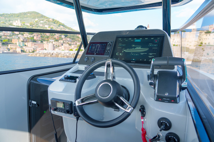 O aproveitamento de espaço é exemplar: há armazenamento hidráulico sob o sofá traseiro, espaço sob o solário dianteiro e nichos ideais para Seabobs ou brinquedos náuticos. Para maior proteção, podem ser instaladas cortinas transparentes amovíveis em torno do hardtop, criando uma zona de comando fechada.
