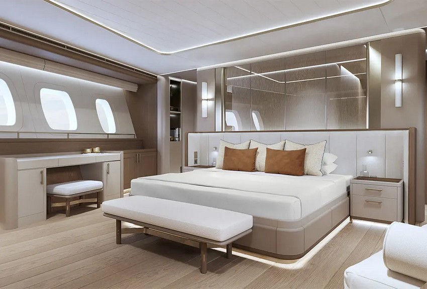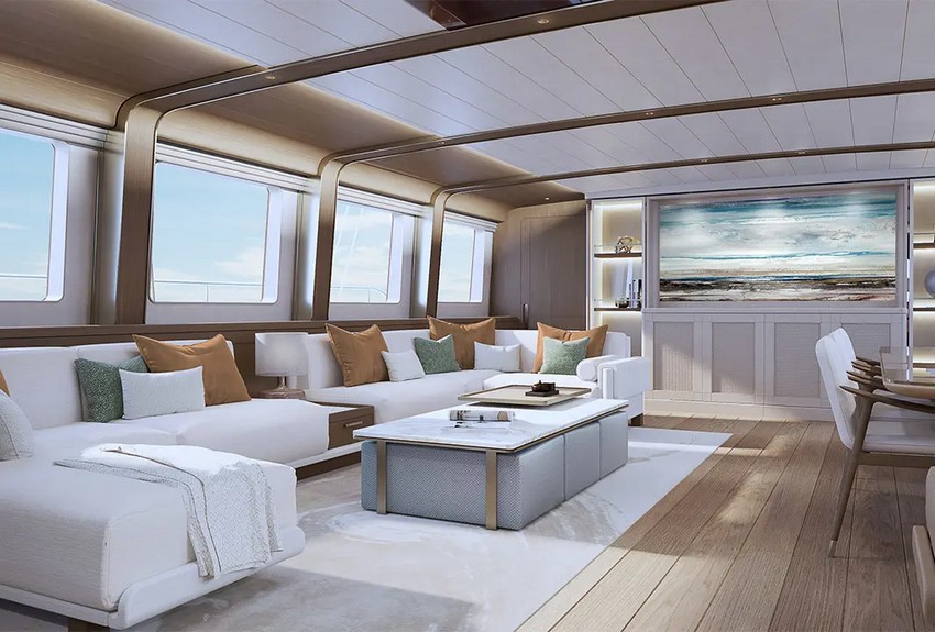 No interior, o ambiente é de sofisticação discreta. Mobiliário em nogueira, couro e tecidos texturizados em tons suaves e detalhes em latão envelhecido criam uma atmosfera rica e envolvente. Os chuveiros são revestidos com azulejos decorativos e mármores Calacatta Oro e Patagonia White. Entre as comodidades modernas, destacam-se os sistemas de TV retrátil no salão e na suite principal, discretamente integrados para preservar as linhas limpas e o espírito intemporal do iate.