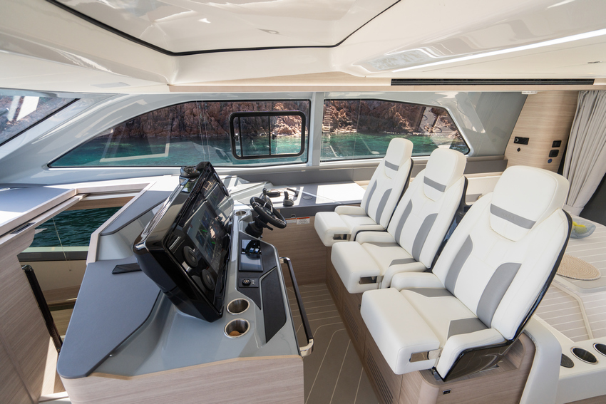 O design do 46 Coupe dá ênfase à versatilidade e ao aproveitamento do espaço. O espaçoso cockpit de popa inclui uma área de bar integrada que liga as zonas de entretenimento interiores e exteriores, enquanto o teto de abrir elétrico de grandes dimensões oferece proteção contra o sol e as intempéries. As janelas panorâmicas inundam o interior de luz natural, e uma porta em fibra de carbono acionada eletricamente dá acesso à área de estar na proa. O casco de duplo degrau funciona em conjunto com o sistema de *foiling* de série para melhorar a eficiência a velocidades de cruzeiro.