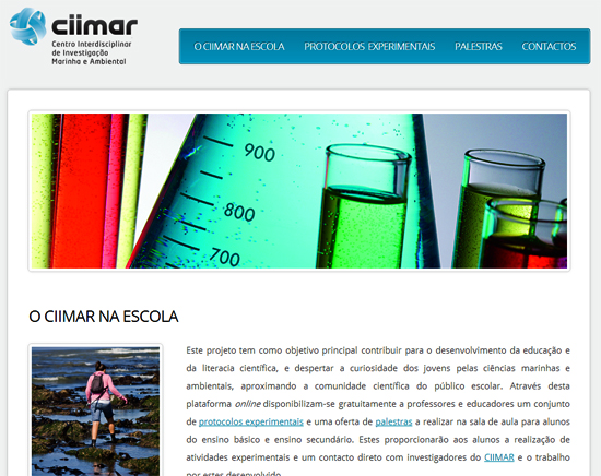 O CIIMAR (Centro Interdisciplinar de Investigação Marinha e Ambiental da Universidade do Porto) em parceira com os Centros de Monitorização e Interpretação Ambiental (CMIAs) de Vila do Conde e Matosinhos lançou no início do ano letivo o projeto O CIIMAR nas Escolas (www.ciimar.up.pt/oCIIMARnaEscola), que foi recentemente aprovado para financiamento pela Ciência Viva. O projeto tem como objetivo despertar a curiosidade dos jovens pelas Ciências Marinhas e Ambientais; aproximar a comunidade científica do público escolar e promover a partilha de conhecimentos e recursos entre o CIIMAR e as escolas.