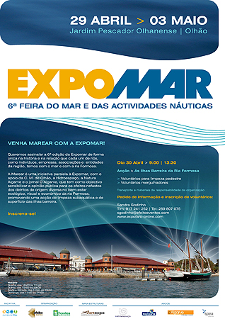 A Câmara Municipal de Olhão, em colaboração com o Instituto das Pescas da Investigação e do Mar (IPIMAR) e a Universidade do Algarve, organiza a sexta edição da Expomar, que abriu portas no Jardim Pescador Olhanense da cidade, no dia 29 de Abril, às 18h00. Esta feira, a maior a sul do país dedicada ao mar e às actividades náuticas, pode ser visitada até 3 de Maio.Nesta inauguração oficial, marcam presença o presidente da Câmara Municipal de Olhão, Francisco Leal, a governadora civil de Faro, Isilda Gomes, o reitor da Universidade do Algarve, João Guerreiro, o director do IPIMAR, Carlos Costa Monteiro, o director regional de Agricultura e Pescas, Castelão Rodrigues, entre outras entidades.