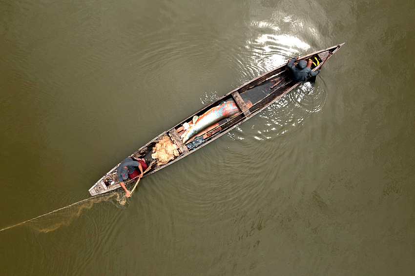 Assunto: Vista de drone de pescadores em canoa com pirarucu pescado no manejo do Lago Serrado