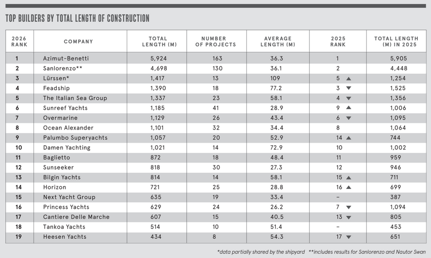 Pelo vigésimo sexto ano, o Grupo Azimut|Benet­ti confirma a sua posição no topo do Global Order Book, o ranking internacional compilado pela BOAT International, que desde 1992 analisa a produção mundial de megaiates com base nos dados de 190 estaleiros a operar nos cinco continentes.
