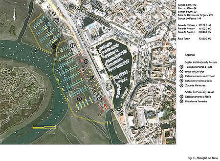 A empresa projectista apresentou 3 soluções de ocupação para a infra-estrutura, todas localizadas na parte exterior da actual Doca de Recreio, conforme a declaração de impacte ambiental aprovada, tendo o Executivo Municipal optado pela Solução de Base que contempla dois sub-sectores, sendo um destinado à náutica de recreio e o outro destinado à pesca artesanal, que actualmente estacionam na doca interior, prevendo-se uma capacidade para estacionamento de 228 embarcações de recreio, de dimensões variáveis e cerca de 144 embarcações de pesca de pequenas dimensões, representando aproximadamente 20844,4m² de área de aterro, para um total de 72420,2 m² onde se inclui estruturas de apoio em terra, estacionamentos para embarcações e automóveis e passeios de lazer.