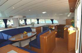 A grande mesa de navegação, assim como a cozinha em forma de L com