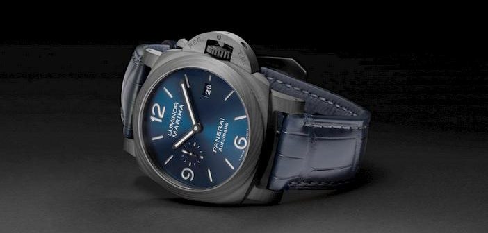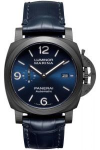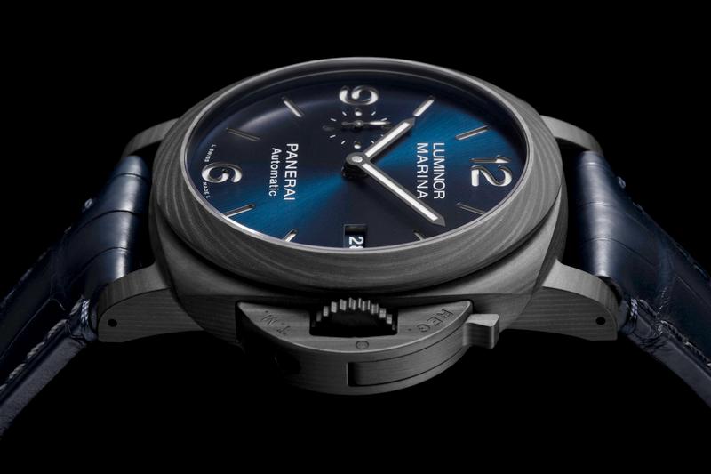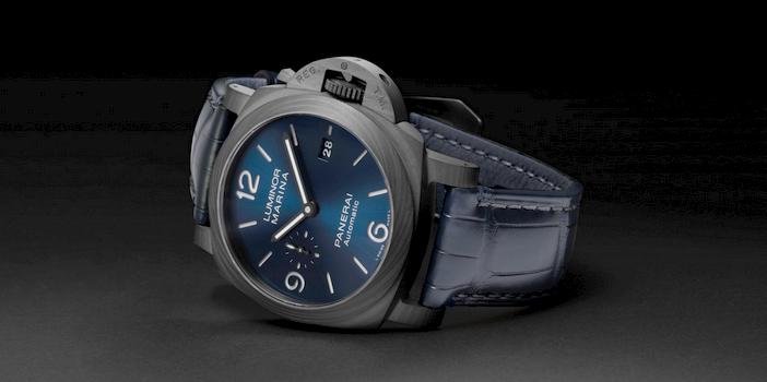Hermético até 30 bares (cerca de 300 metros de profundidade), o Luminor Marina Carbotech Blu Notte vem equipado com uma correia em pele de crocodilo Blu Notte com acabamento mate, uma correia azul escura em borracha em um fecho trapezoidal em titânio com revestimento DLC.