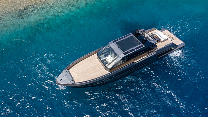 Powered by three Volvo Penta IPS units (1,000hp each) and built of a carbon composite in a lightweight sandwich construction for maximum rigidity and strength, the deep-V hull has a deadrise of 19 degrees in the stern and 28 degrees in the bow for a top speed of 40 knots at full load and a cruising speed of 33 knots.