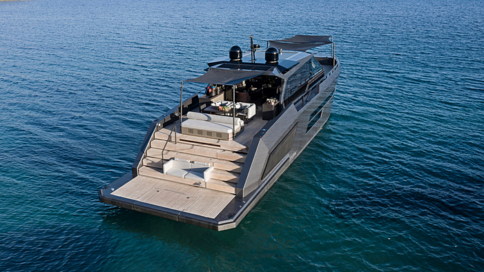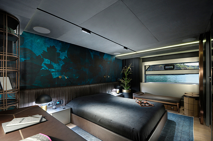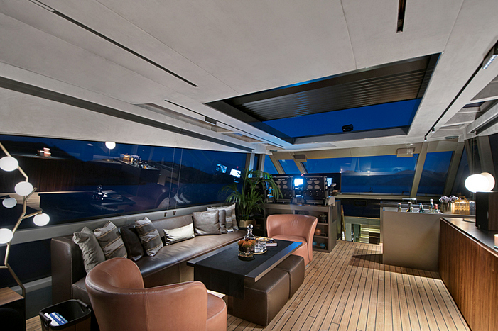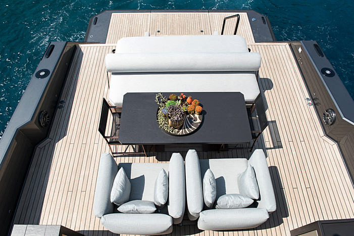“Multifunctional design was very important for the owner,” says Yukay. “In fact, the open foredeck has three different uses: as a sunbathing area, a dining area for 12 people, and a screen can be set up to turn it into an open-air cinema.”