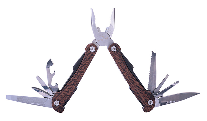 Canivete de alumínio anodizado revestida a madeira (10 ferramentas) com trava de segurança: lâmina plana, lâmina serrilhada, serra, alicate, lima, ponta, abre garrafas, abre-latas, chave de fendas.