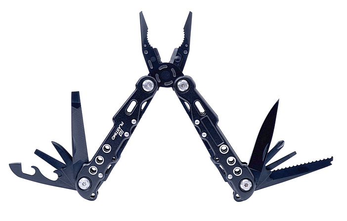 Canivete multi-funcional de alumínio anodizado preto (18 ferramentas) com travão de segurança: lâmina plana, lâmina serrilhada, serra, alicate, lima, ponta, saca rolhas, abre-latas, chave de fenda plana de 3 tamanhos, chave de fenda Phillips de 3 tamanhos, chave de fenda sextavada 3 tamanhos.