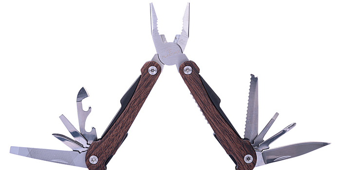 Canivete de alumínio anodizado revestida a madeira (10 ferramentas) com trava de segurança: lâmina plana, lâmina serrilhada, serra, alicate, lima, ponta, abre garrafas, abre-latas, chave de fendas.