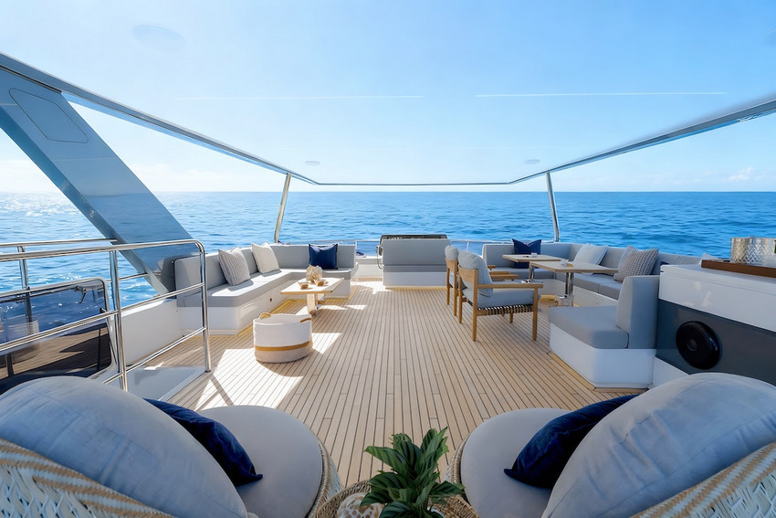 – Um destaque incontornável — o flybridge com mais de 50 m² — torna-se o centro social emblemático da embarcação.