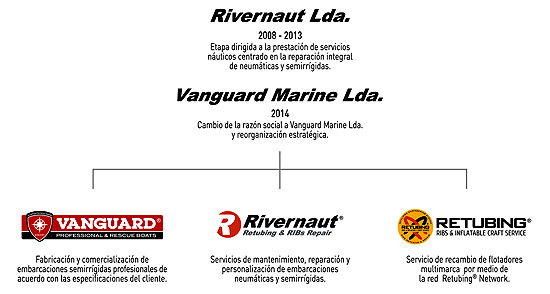 Com esta reorganização, na atual Vanguard Marine Lda temos um importante incremento de infraestruturas, meios técnicos e humanos. Estabeleceram-se três áreas de trabalho diferenciadas: a marca Vanguard (fabricação e comercialização); Rivernau (servíços de manutenção e reparação) e Retubing (serviços de mudanças de flutuadores multimarca).
