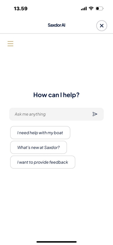 Integrada na aplicação MySaxdor, a Saxdor AI é um assistente inteligente de navegação que guia os proprietários nas funcionalidades e utilização, fornece inspiração e oferece apoio personalizado sempre que necessário, ajudando-os a tirar o máximo partido do seu Saxdor desde o primeiro dia. A Saxdor AI atua como um co-skipper digital, tornando a navegação mais fácil desde a posse até ao uso diário, ao fornecer orientações, suporte e dicas práticas sem necessidade de contactar o concessionário. Desde verificações rotineiras de combustível e energia até ao conforto a bordo, a plataforma simplifica todas as tarefas e integra todos os aspetos do iate num único sistema inteligente, permitindo aos proprietários desfrutar de mais tempo na água.