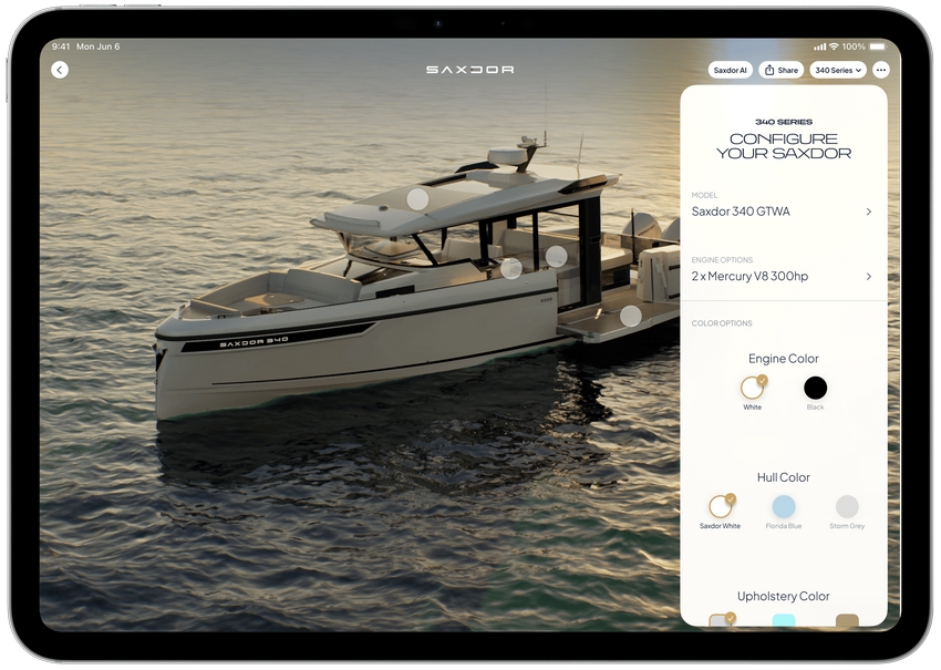 Para além da solução de IA, a Saxdor está a transformar a experiência digital na náutica com o seu Digital Showroom, desenvolvido pela empresa finlandesa Younite AI. Recorrendo à inteligência artificial e à tecnologia de gémeo digital, esta plataforma fotorrealista permite que clientes e concessionários explorem a frota num ambiente imersivo, com reflexos de dia e de noite, vistas detalhadas de interiores e exteriores, e configuração em tempo real. Alimentado por modelação 3D altamente detalhada, o showroom proporciona um nível de precisão e profundidade inatingível pelos configuradores tradicionais. Com a Saxdor AI integrada, os clientes podem ainda colocar questões práticas, como por exemplo se é possível adicionar ar condicionado a um modelo específico, e obter respostas instantâneas e personalizadas. O Digital Showroom permite visualizar, personalizar e encomendar iates diretamente, criando uma experiência fluida e envolvente.