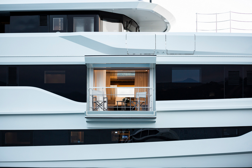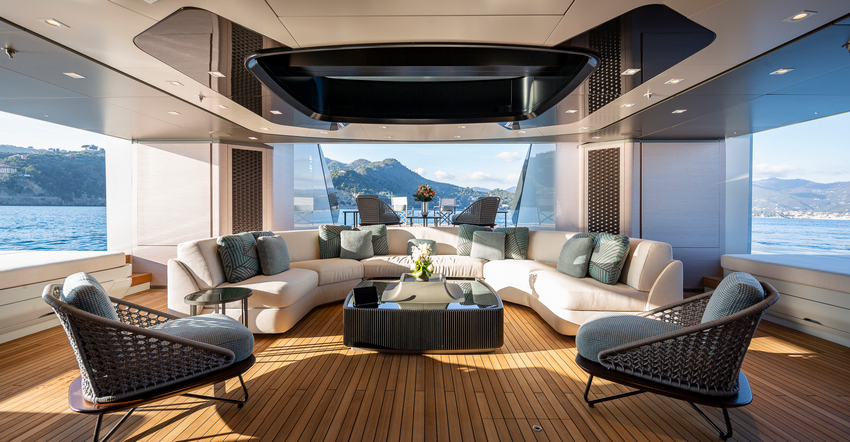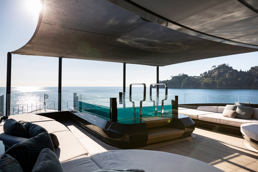 Up top on the fly deck there’s a pool with built-in spa jets developed in-house by the shipyard, and a generous lounging and alfresco dining area aft. The central section is given to a protected, enclosed gym with spectacular views out to keep guests inspired while working out. Glass doors fore and aft can be left open to create and inside/outside area through which the breeze can blow freely, or closed off to function as a sun-sheltered and climate controlled retreat. Alongside the pool, a custom-designed bar and two round sunbeds complete the amenities.
