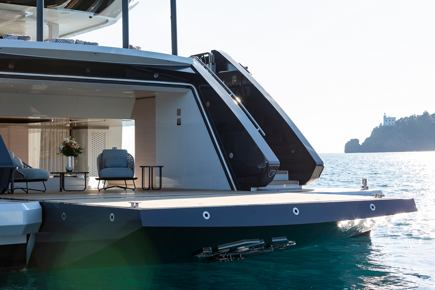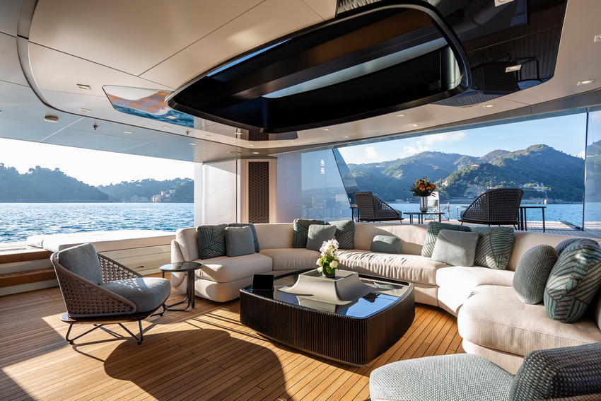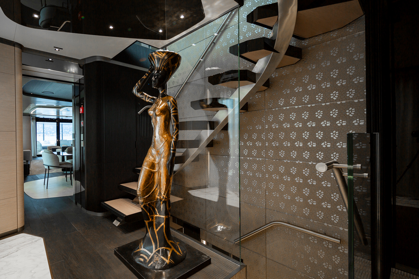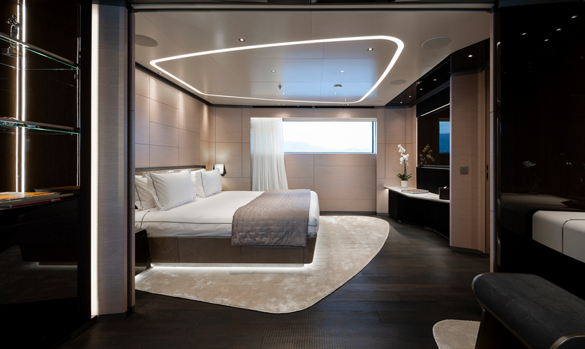 Ceilings, Paszkowski points out, also feature prominently in the design. “They blend lacquered pearl grey and grey-brown panels,” he enthuses. “Integrated LED strips run along irregular, curved beams around the ceiling perimeters, accentuating key areas like the living spaces on the main and upper decks. This thoughtful lighting design highlights the round-shaped sofas and the cozy conversation area in the owner’s suite.”