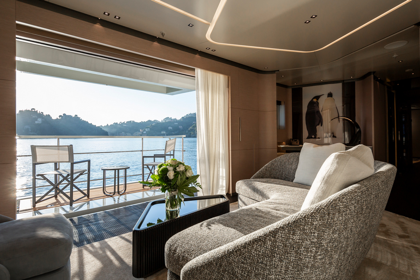 Nearly all the onboard furniture was custom-designed, including coffee tables in the living spaces, the owner’s suite and the beach club lounge, as well as the owner’s office desk and galley counter. These bespoke elements are complemented by high-end pieces from renowned brands including Minotti sofas, armchairs, dining tables, and chairs that furnish the main and upper deck living areas, as well as the owner’s suite. Poltrona Frau stools add refinement to the galley, which also serves a dual purpose as an owner and guest area – the owners love to cook.