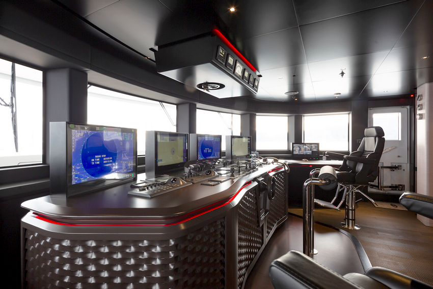 The wheelhouse also gets its own design treatment, highlighting its more technical nature, for which the team drew inspiration from automotive design. The use of dark brown hard leather, accented by subtle red details, achieves a refined balance between elegance and functionality. This masculine and understated ambiance sets the wheelhouse apart from the yacht’s other interiors, reflecting its focused and specialized purpose.