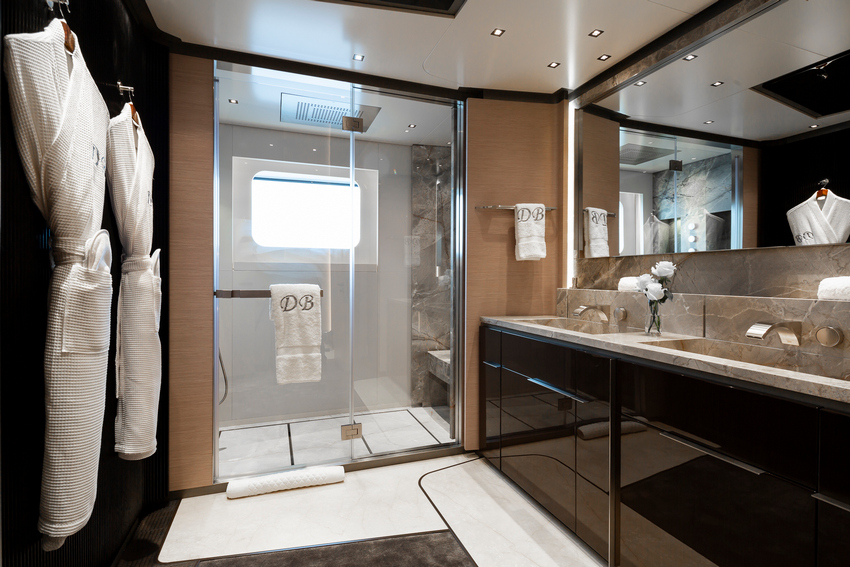 Marble surfaces lend luxurious touches throughout. Cappuccino marble adorns the coffee table tops on the main deck, while Calacatta marble enriches the lobby. Botticino marble is used for the dining area floors, and Fior di Bosco marble highlights the bathrooms. Smoked glass features prominently in the bathroom doors for the VIP suites and the owner’s dressing room, offering a sleek and modern aesthetic.
