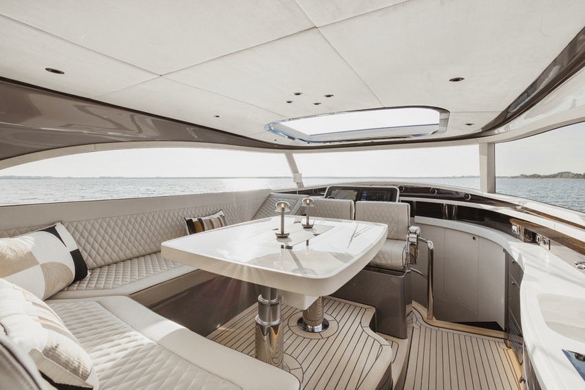 Embora a Zeelander descreva o modelo como um dayboat, o interior oferece um nível de sofisticação raramente visto neste segmento. O salão de convés combina sofás profundos com uma zona de refeições para quatro pessoas e vistas panorâmicas de 360 graus, alcançadas através da eliminação dos tradicionais montantes das janelas.